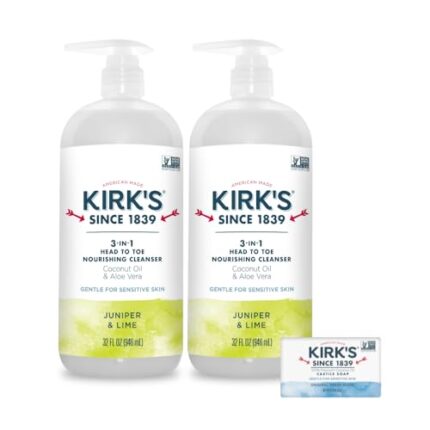 Kirk’s 3-in-1 Head to Toe Nourishing Liquid Cleanser & Travel Size Bar Soap – for Men, Women & Children – Premium Coconut Oil and Aloe Vera- Non GMO & Vegan -Juniper & Lime – 32 Fl Oz. 2 pack