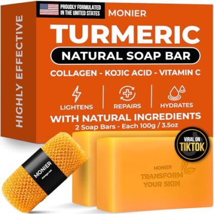 Turmeric Soap Bar for Dark Spots – With Kojic Acid, Collagen, Coconut Oil, Vitamin C, Vitamin E – Moisturizing & Nourishing – Vegan & Natural (2 Soap Bars + Storage Net)