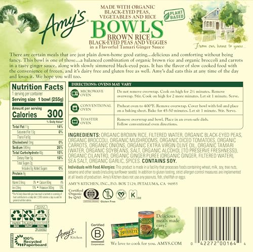 Amy’s Brown Rice, Black-Eyed Peas and Veggies Bowl is made with slow-simmered organic black-eyed peas, fluffy organic brown rice, all mixed with tender organic broccoli and sweet carrots. Combine that with its tasty ginger sauce and this simple meal becomes something the whole family can enjoy. Convenient and easy to prepare, this Amy’s Brown Rice, Black-Eyed Peas and Veggies Bowl contains soy, protein (11g per serving), dietary fiber (8g per serving), and is gluten free, dairy and lactose free, and tree nut free. It is also suitable for vegan and kosher diets. Since 1987, we at Amy’s Kitchen have produced delicious, convenient foods for people who are sometimes too busy to cook. Amy’s is a family-run business, and we supervise every aspect of our business and take pride in customer satisfaction. All the fruits, vegetables and grains we use are grown without the use of insecticides, GMOs and other harmful chemicals. We prepare these ingredients with the same careful attention in our kitchen as you would in your own home for high-quality, home-style vegetarian and vegan meals. No meat, fish, shellfish, poultry, eggs or peanuts are ever used in any Amy’s products. Even though you’re heating up our meals in your home, we want each bite to taste like you’re a guest in ours.