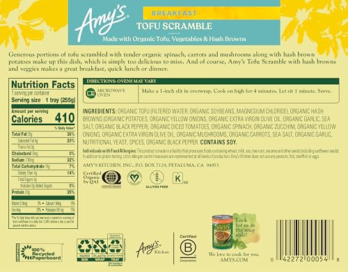 Amy’s Tofu Scramble offers a generous portion of made-from-scratch tofu scrambled with a mix of organic vegetables, hash brown potatoes and sliced tomatoes on the side. Convenient and easy to prepare (with 22g of protein per serving), this Amy’s Tofu Scramble contains soy, is non-GMO, gluten free, dairy and lactose free, and tree nut free. It is also suitable for vegan and kosher diets. Since 1987, we at Amy’s Kitchen have produced delicious, convenient foods for people who are sometimes too busy to cook. Amy’s is a family-run business, and we supervise every aspect of our business and take pride in customer satisfaction. All the fruits, vegetables and grains we use are grown without the use of insecticides, GMOs and other harmful chemicals. We prepare these ingredients with the same careful attention in our kitchen as you would in your own home for high-quality, home-style vegetarian and vegan meals. No meat, fish, shellfish, poultry, eggs or peanuts are ever used in any Amy’s products. Even though you’re heating up our meals in your home, we want each bite to taste like you’re a guest in ours.