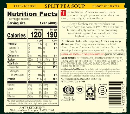 Amy’s Organic Split Pea Soup comes from a traditional recipe and tastes like homemade. Organic split peas, onions, carrots and celery are carefully prepared by our chefs, then seasoned with basil, garlic and bay leaf for a hearty soup that’s sure to satisfy. Every BPA free can of Amy’s Organic Split Pea Soup is vegan, USDA organic, and does not contain gluten, corn, soy or tree nuts. Plus it’s low fat, with just 1 gram of fat per cup. It’s easy and convenient to have a delicious, homemade-tasting bowl of soup in minutes—just heat and serve. Since 1987, we at Amy’s Kitchen have produced delicious, organic, convenient foods for people who are sometimes too busy to cook. Amy’s is a family-run business, and we supervise every aspect of our business and take pride in customer satisfaction. All the fruits, vegetables and grains we use are grown without the use of insecticides, GMOs and other harmful chemicals. We prepare these ingredients with the same careful attention in our kitchen as you would in your own home for high-quality, home-style vegetarian and vegan meals. No meat, fish, shellfish, poultry, eggs or peanuts are ever used in any Amy’s products. Even though you’re heating up our meals in your home, we want each bite to taste like you’re a guest in ours.