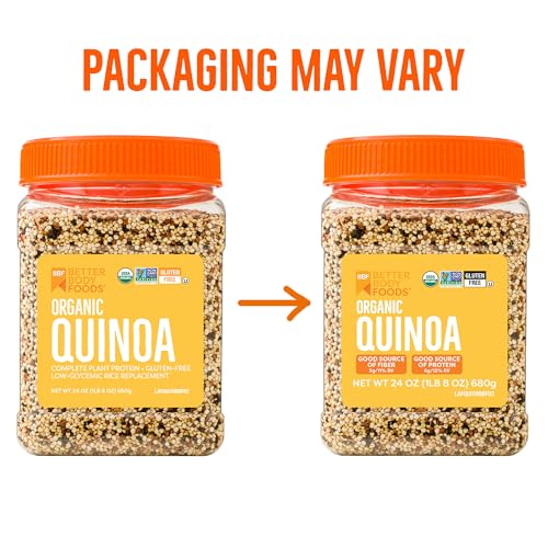 Finding foods with lots of nutrients can be helpful for people who are trying to change their diet and live a better life. It can be difficult to get enough good stuff into your diet to provide you with useful vitamins and other nutrients. Our organic Quinoa is a nutrient powerhouse and includes one impressive ingredient: organic Quinoa. Each serving contains 6 grams of protein, and 3 grams of fiber leaving you feeling fuller for longer. It also has only 2.5 grams of fat and 170 calories per serving. It also includes all 9 essential amino acids! Quinoa is the perfect substitute for brown or white rice and can be paired well with stir-fried vegetables and other dishes. Before cooking your multicolored quinoa, rinse it with water. Once it has been rinsed, combine 1 cup of quinoa with 2 cups of water in a medium pot and bring to a boil. After it begins to boil, cover the pot and reduce heat to medium-low and let simmer for about 15 – 20 minutes until the water is absorbed. With a light nutty flavor, Our quinoa can be eaten with a variety of savory flavor profiles that your entire family will love. The possibilities are endless! Our organic Quinoa is gluten-free, non-GMO, Kosher, and USDA Organic Certified, making it an essential powerhouse grain for your pantry. Betterbody Foods is determined to bringing you quality products that are better for your body but don’t make you sacrifice the flavors that you enjoy. Find food that you’ll love to love with our 1.5 lbs. Container of organic Quinoa!