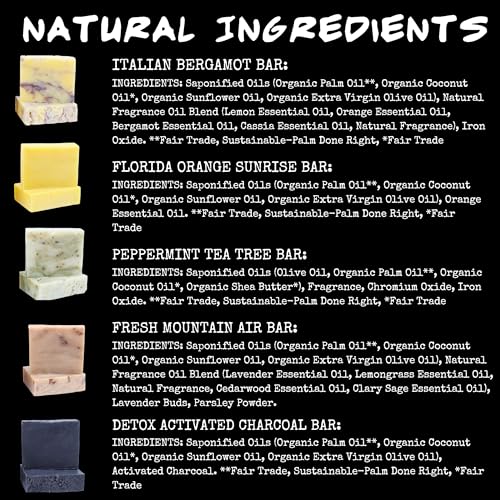 Indulge in our 5-pack variety of organic bar soaps, ideal for gifting. Experience cleansing, energizing, exfoliating, moisturizing, and soothing skin sensations with each natural organic bar soap. Includes (1) Clarifying Italian Bergamot, (1) Energizing Florida Orange Sunrise, (1) Invigorating Peppermint Tea Tree, (1) Fresh Mountain Air with Lavender, and (1) Detoxifying Activated Charcoal Soap Bar.”