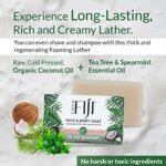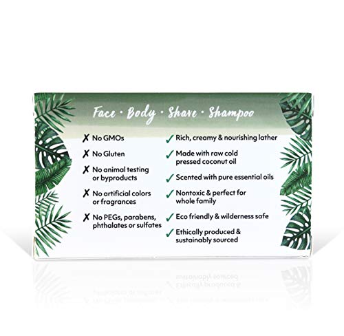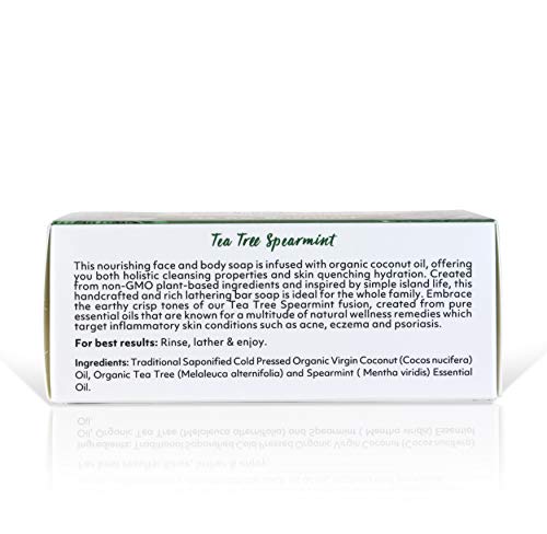COCONUT : Wake up with the fresh aroma of Tea Tree Spearmint! Our coconut bar soap for men and women contains coconut oil to hydrate and gently pamper your skin and leaves a smooth finish. This multi-function organic soap gives a rich creamy lather which can be used to cleanse your face & body, shave and even shampoo . Our organic soap is Non-GMO, Vegan, Gluten Free, Cruelty Free, Ecofriendly & Biodegradable, Ethically Sourced and Sustainably Produced.