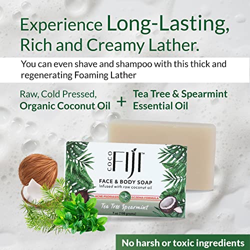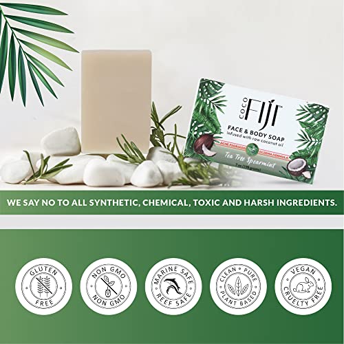 Ultra Nourishing Recipe : Coco fiji soap for men and women is handcrafted and created using an ancient Fijian recipe. This process is a great way to make Vegan bar soap that is perfect for skin and environment with the ingredients from a sustainable source. Multi-functional this soap does it all, Cleanse, Shave, Shampoo! Our gentle soap pampers and moisturizes the skin with ultra rich-nourishing lather, rinsing off clean without residue and leaving only the fresh scent of Tea Tree Spearmint.