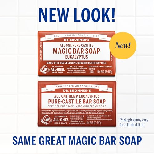 Dr. Bronner’s Pure-Castile Magic Soap Bars (Eucalyptus, 5 oz, 6-Pack)- Made with Regenerative Organic Certified Oils for Face, Body & Hair – Gentle, Biodegradable, Vegan- Bar Soaps for Men & Women