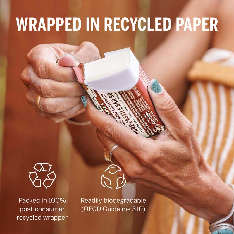 PACKAGED IN POST-CONSUMER RECYCLED WRAPPERS: Dr. Bronner’s bar soaps divert discarded paper waste from landfills by using and increasing demand for recycled materials, reducing landfill buildup. Readily biodegradable (pursuant to OECD Guideline 310)