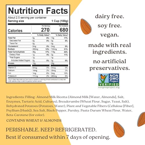Our Almond Milk Ricotta Tortellini is a non dairy recipe, soy free, vegan and is Non-GMO Project verified with no artificial flavors or preservatives