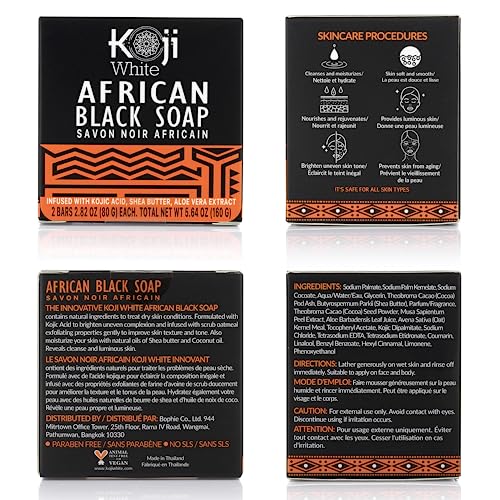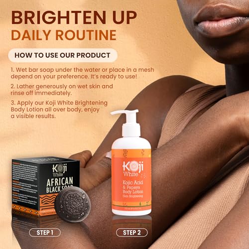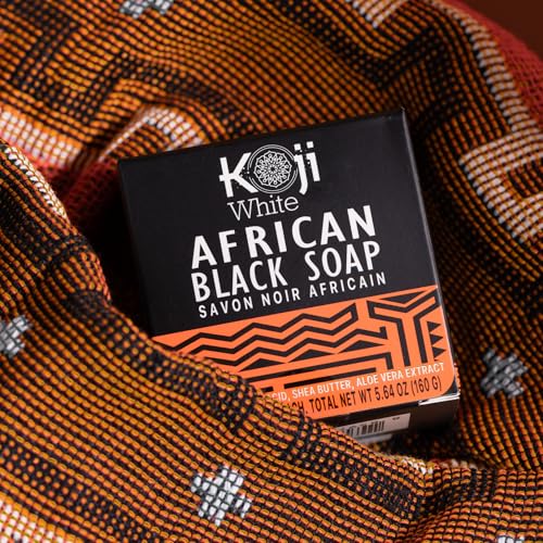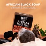 Koji White African Black Soap Bar with Kojic Acid for Exfoliating Body Wash – Face Exfoliating Soap & Face Moisturizer with Shea Butter, Aloe Vera, Coconut Oil – Vegan, Paraben-Free, 2.82oz (2 Bars)