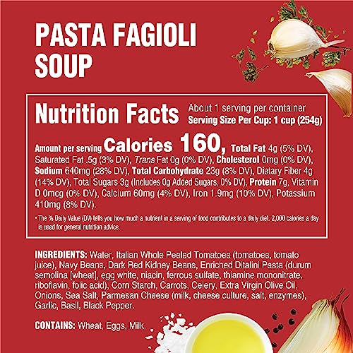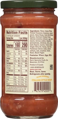 Bring home the taste of Rao’s Made for Home® Soup! Our pasta & fagioli soup is Italian tomato broth with navy beans, dark red kidney beans, ditalini pasta, carrots, celery and parmesan cheese.