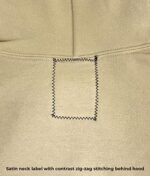Satin neck label with contrast zig-zag stitching behind hood under neck.