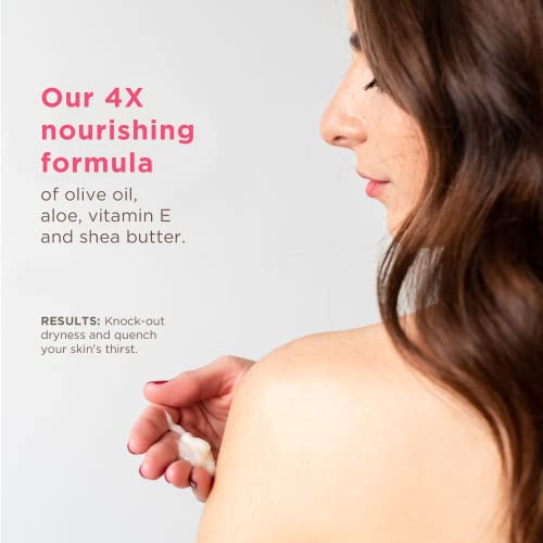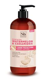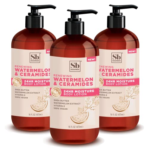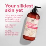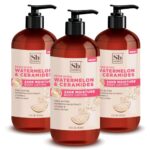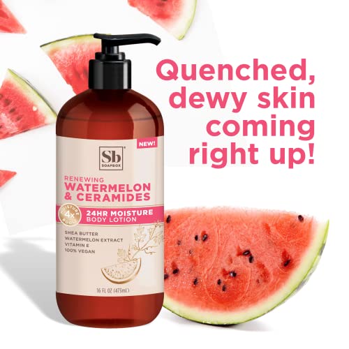 NOURISHING BODY AND FACE LOTION with renewing watermelon extract, Shea Butter and Vitamin E, olive oil and vitamins. Creamy, Soothing vegan lotion hydrates for silky skin in convenient lotion set of 3.