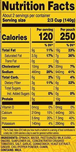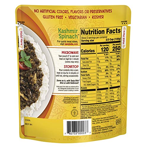 Curried spinach sauteed with paneer cheese. 90 Seconds Heat and Eat, no cooking. Tasty Bite products come in a unique smart pouch that seals in wholesome flavors and nutrients. Requires no refrigeration until pouch is opened. Great for camping, hiking, work, anywhere you go. Meal ideas: serve with rice or Indian flat bread, as a delicious entree, a sidedish or entree. Integrate into your favorite recipe for a fresh meal solution. All natural, vegetarian, vegan, gluten free, no MSG, no preservatives, kosher, no refrigeration, 18 month shelf life. Product of India. Try all of Tasty Bite’s delicious Indian and Pan-Asian inspired products: Meal Inspiration, Entrees, Simmer Sauces and Rices.